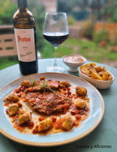 En esta ocasión he elegido un tinto de Bodegas Protos Roble con cuatro meses en barrica que me encanta, es un vino genial, amable, sedoso, con excelentes aromas y un buen sabor que acompaña a mi carne a las mil maravillas.