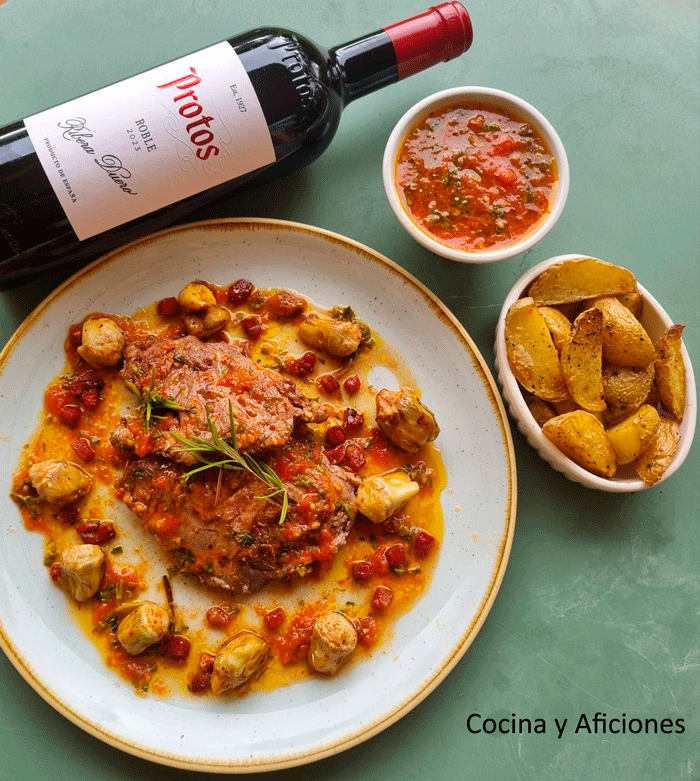 En esta ocasión he elegido un tinto de Bodegas Protos Roble con cuatro meses en barrica que me encanta, es un vino genial, amable, sedoso, con excelentes aromas y un buen sabor que acompaña a mi carne a las mil maravillas.