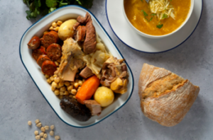 ¿A quién no gusta un buen cocido madrileño? Este tipo de cocido, conocido por todos, pero originario de Madrid, tradicionalmente, se sirve en tres vuelcos. En el primero la sopa, en el segundo los garbanzos con las verduras y en el tercero la carne (chorizo, tocino, morcillo…), es un plato contundente y muy completo pensado para comerse despacio.